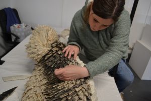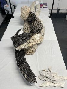 The 4m long sculpture depicts a charred branch, which is slowly blossoming. The charred part of the tree is constructed from thousands of carefully hand folded triangles by the artist herself and painted with crushed charcoal. Leah has incorporated origami cranes folded by volunteers for the 2024 Christian CND 1000 Cranes Campaign, the cranes have been arranged on top of and around the work to appear as flowers growing from the charred remains of a tree. Each crane symbolises an individual praying for peace.
